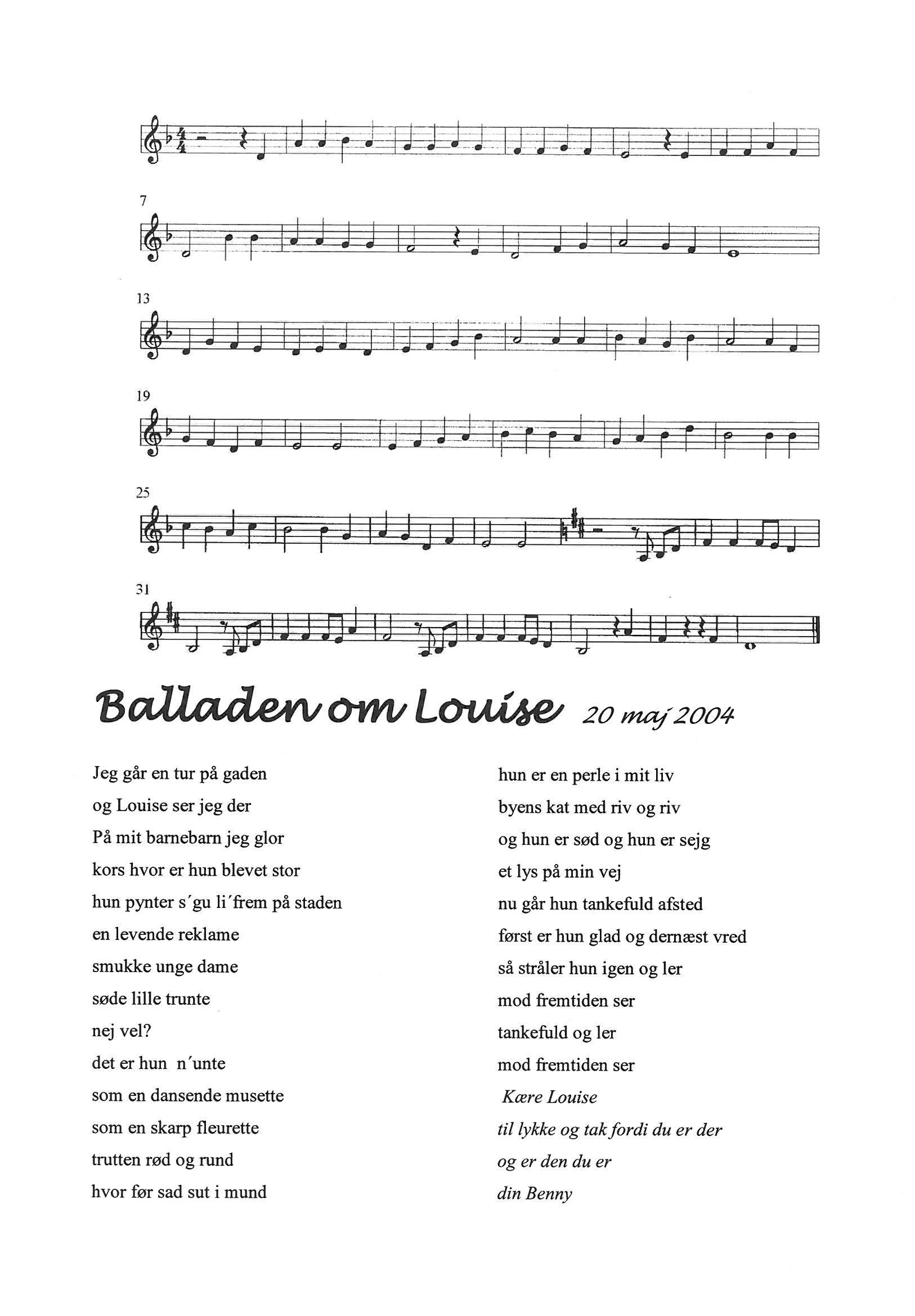 anledning: Louise Marie Busck Lumholt nonfirmation 20/5 2004Arstal: 2004sektion: I Anledning Afpublikationer:I anledning af 7 (manus) Node til Ballade om Louise