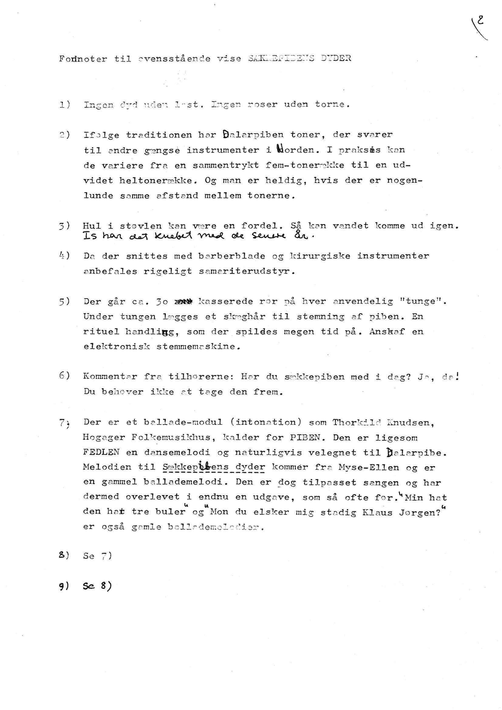 Redigeret af Benny efter Myse Ellen DGF 338/2 sektion: Ballademusikpublikationer:Ballademusik (tryk) Dalarpibens dyder Fodnoter til Sækkepibens dyder Fodnoter til Sækkepibens dyder s. 2 Fodnoter til Sækkepibens dyder s. 3