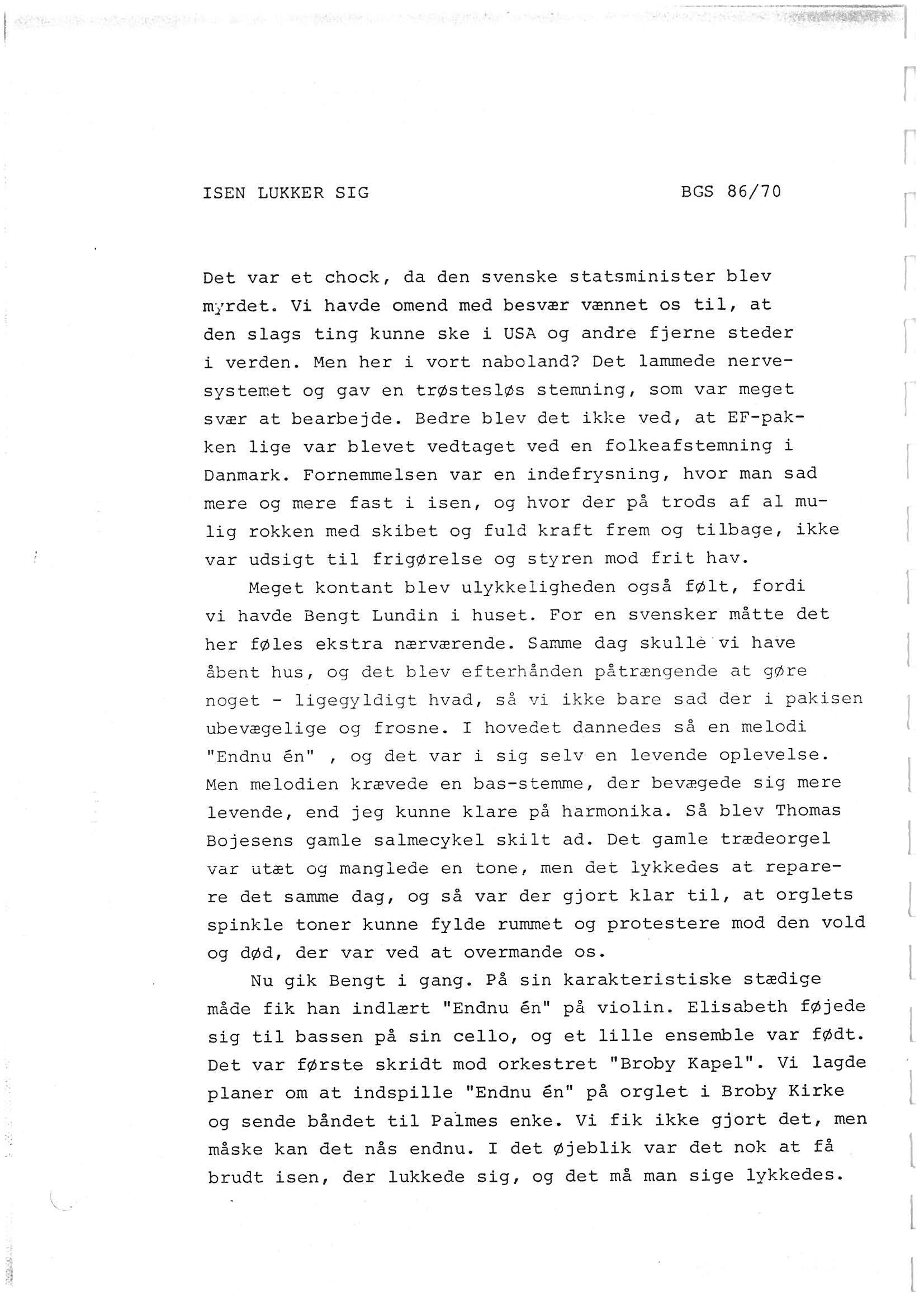 anledning: Til Bengt Lundin i anledning af Oluf Palmes død 28/1 1986Arstal: 1986sektion: I Anledning Afpublikationer:I anledning af 2 (tryk)Her er vi og her er verdens navle (CD) Lyd til Endnu en Node til Endnu én Tekst om Endnu én - Isen lukker sig