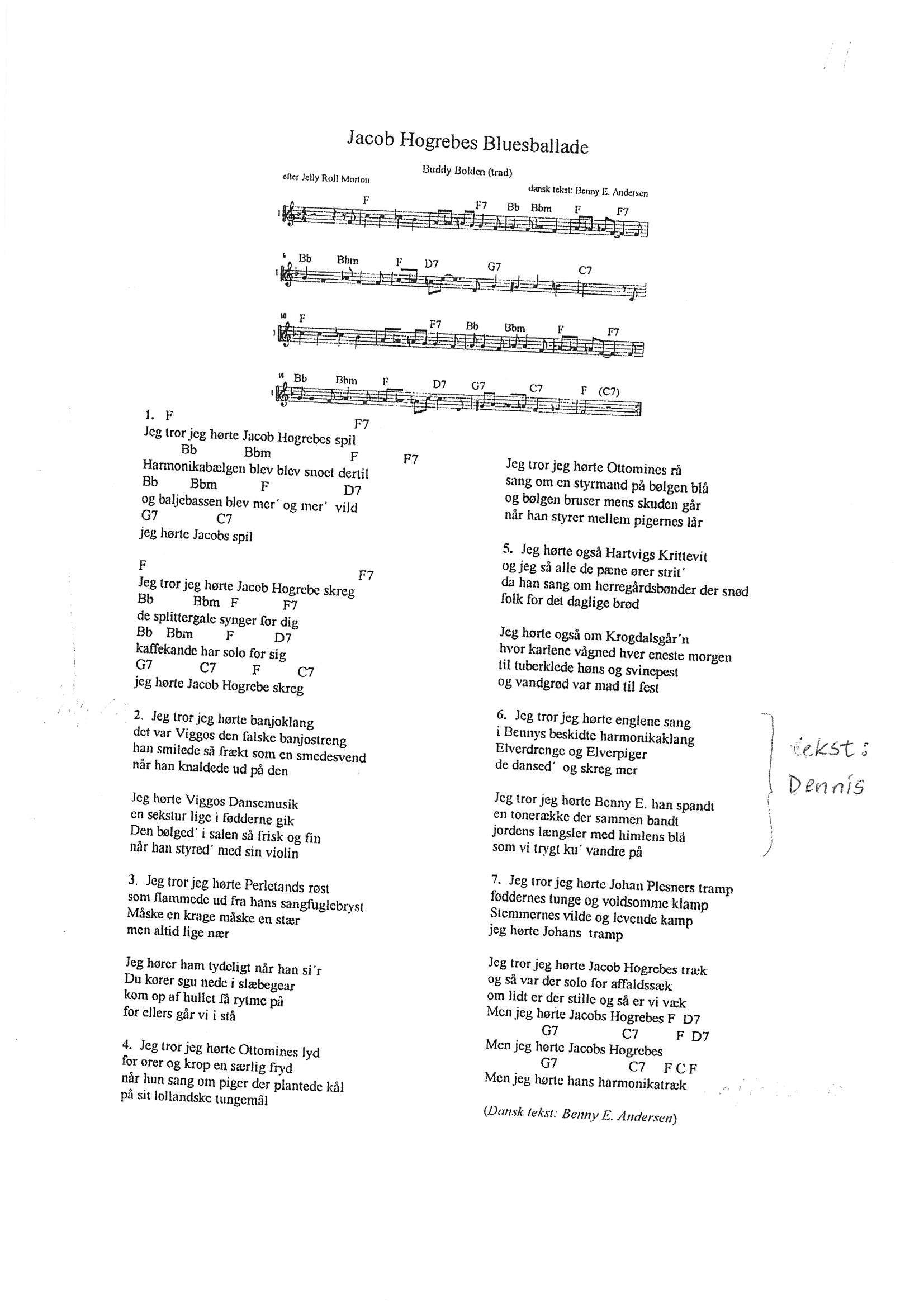 Benny skriver på CD´ens cover: Harmonikabælgen blev snoet dertil. Ikke mange kan sno en harmonikabælg som Jacob, når han spiller sammen med De Splittergale. sektion: Gårdsangerjazzpublikationer:Gårdsangerjazz (CD) Jacob Hogrebes blues Tekst og node til Jacob Hogrebe blues