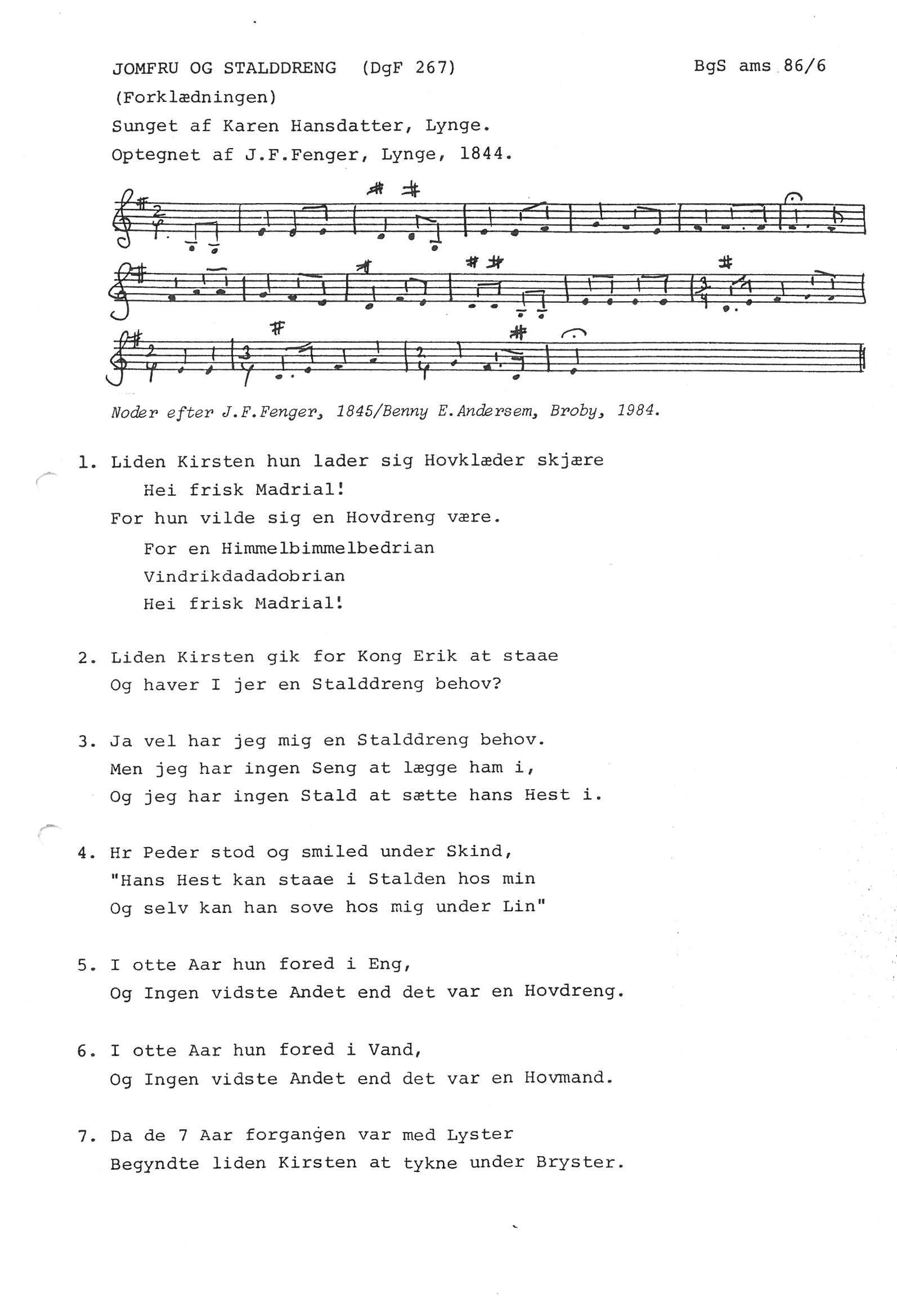 En af Lynge-Broby balladerne indsamlet omkring 1850´erne af Fengerfamilien, Broby. Genplaceret af Benny og Jørgen From Andersen på Broby Gamle Skole omkring 1985. Arstal: 1986sektion: Ballademusikpublikationer:Lynge-Broby ballader (tryk)Broby-Lynge Ballader (CD) lyd til Jomfru og stalddreng Jomfru og stalddreng