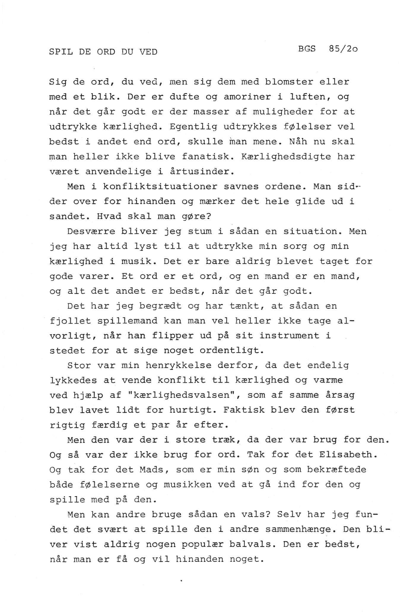 anledning: Elisabth K. Holm 30 år 14/6 1985Arstal: 1985sektion: I Anledning Afpublikationer:I anledning af 1 (tryk) Node til Kærlighedsvalsen Tekst om Kærlighedsvalsen - Spil de ord du ved