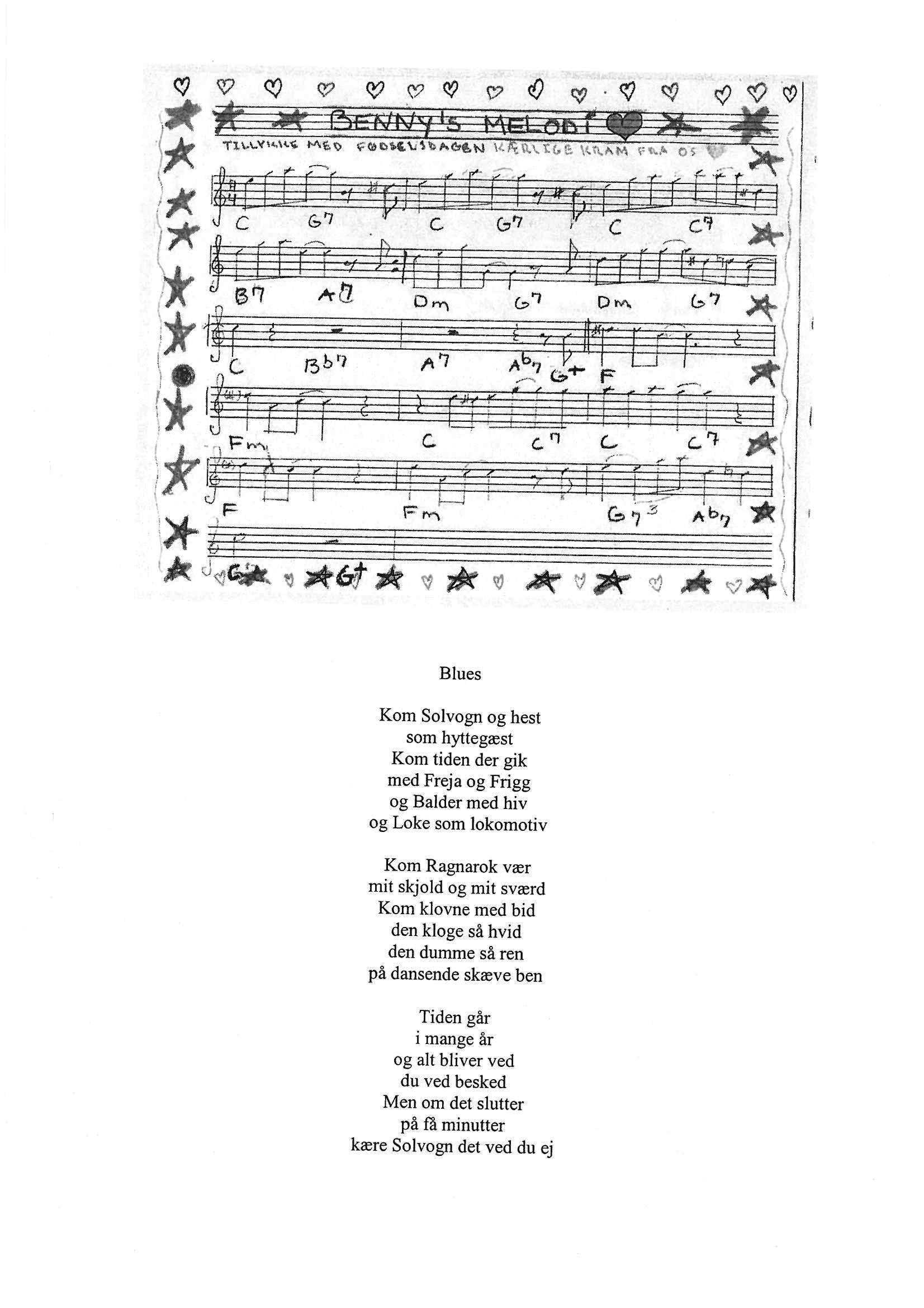Tekst Benny. Melodien er en fødselsdagsgave til Benny fra hans søn Mads Lumholt sektion: Gårdsangerjazz Tekst og node til Kom Solvogn og hest