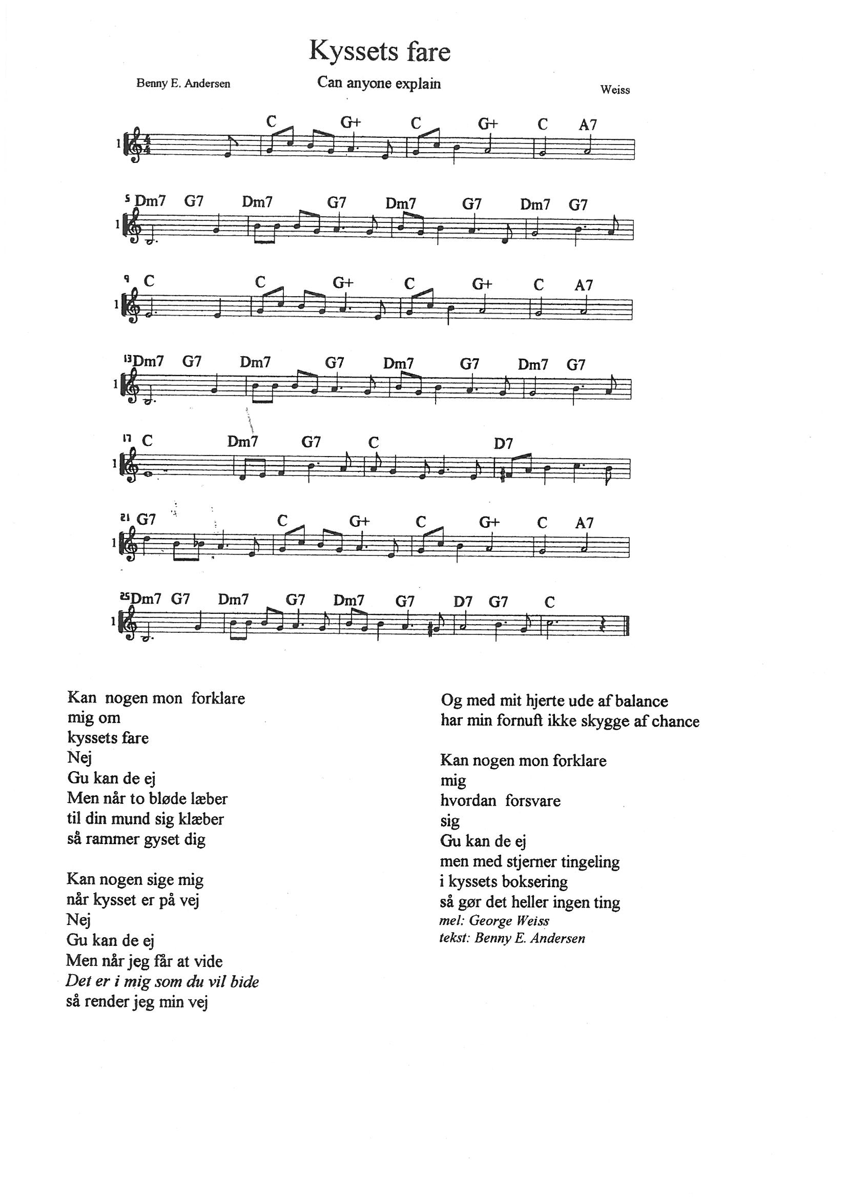 Benny skriver på CD´ens cover: Men det er ikke lutter lagkage. Også start på kyssets boksekamp. På jalousien (melodien Dumme Tøs). På forladtheden (melodien Siden du gik). sektion: Gårdsangerjazzpublikationer:Gårdsangerjazz (CD) Kyssets fare Tekst og node til Kyssets fare