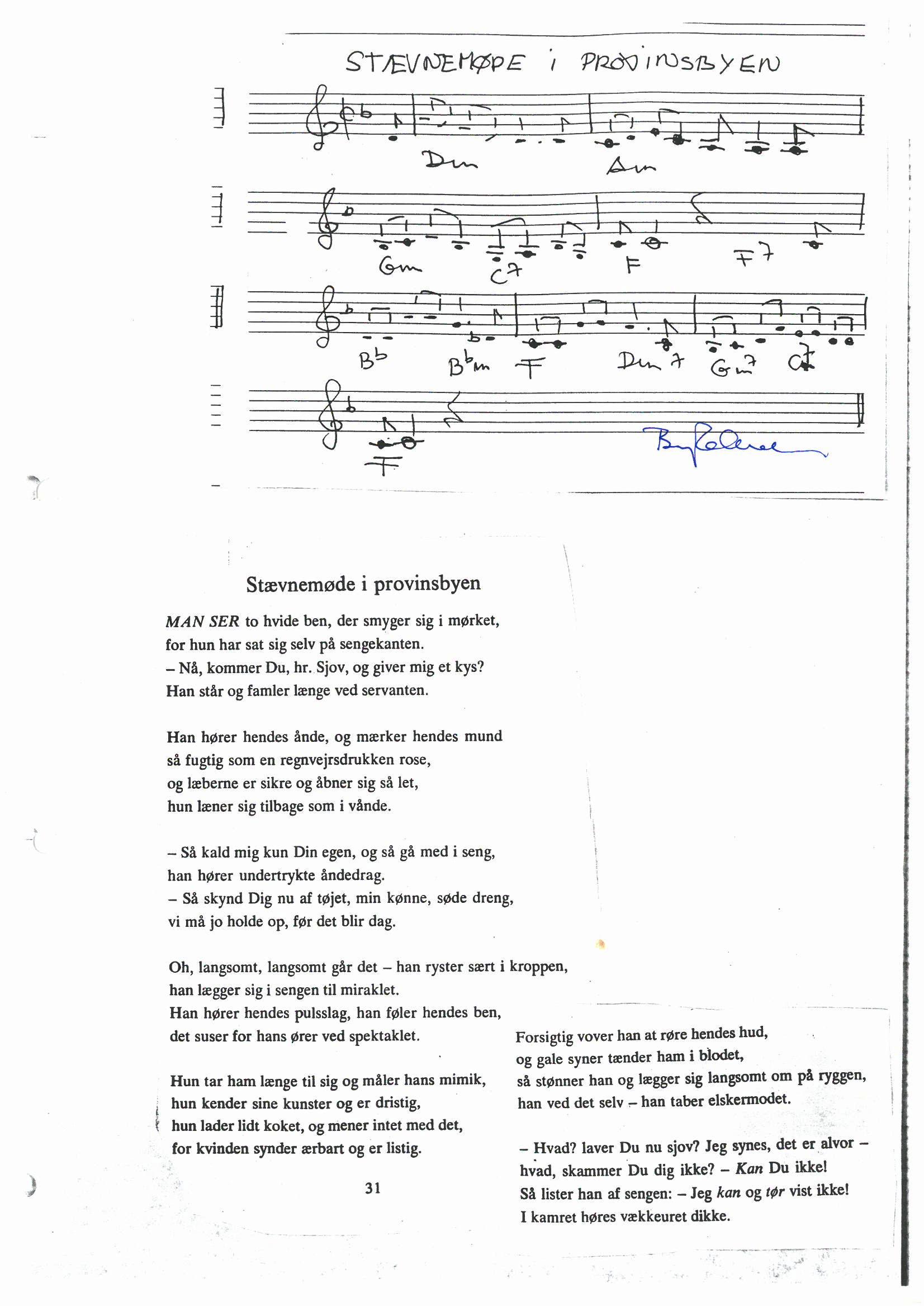 Sjov i Danmark, 1928 Arstal: Ca. 1994sektion: Melodier til digteforfatter: Jens August Schadepublikationer:Sjov i Danmark (CD) lyd til Stævnemøde i provinsen Node og tekst til Stævnemøde i provinsen